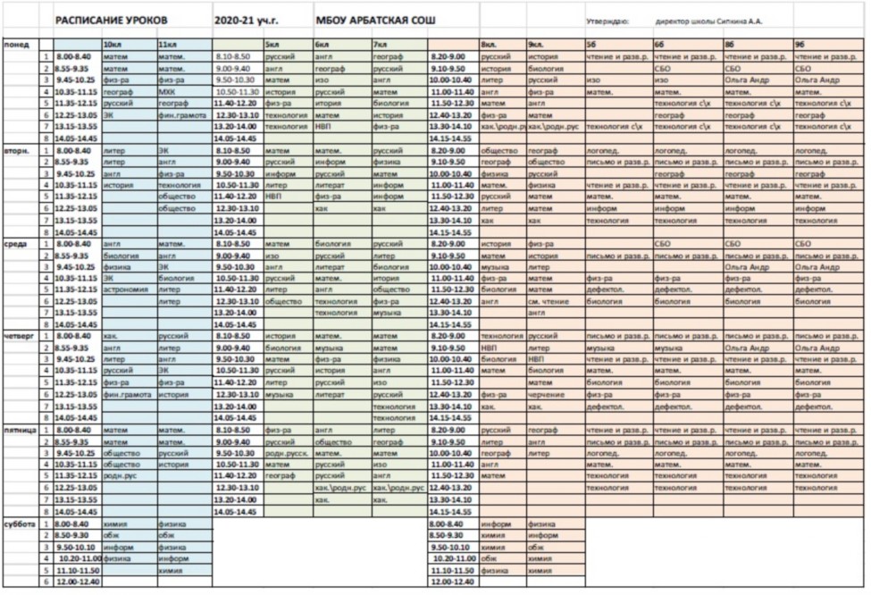 Расписание уроков на 1 полугодие 2020-2021 учебного года ( с 01 сентября по 31 декабря 2020г.)